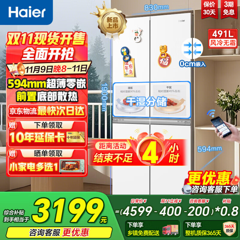 包邮 海尔【国家补贴20%】海尔冰箱491L大容量家用电器零嵌法式十字电冰箱风冷无霜超薄594cmm零嵌一级能效 491升超薄零嵌入式冰箱