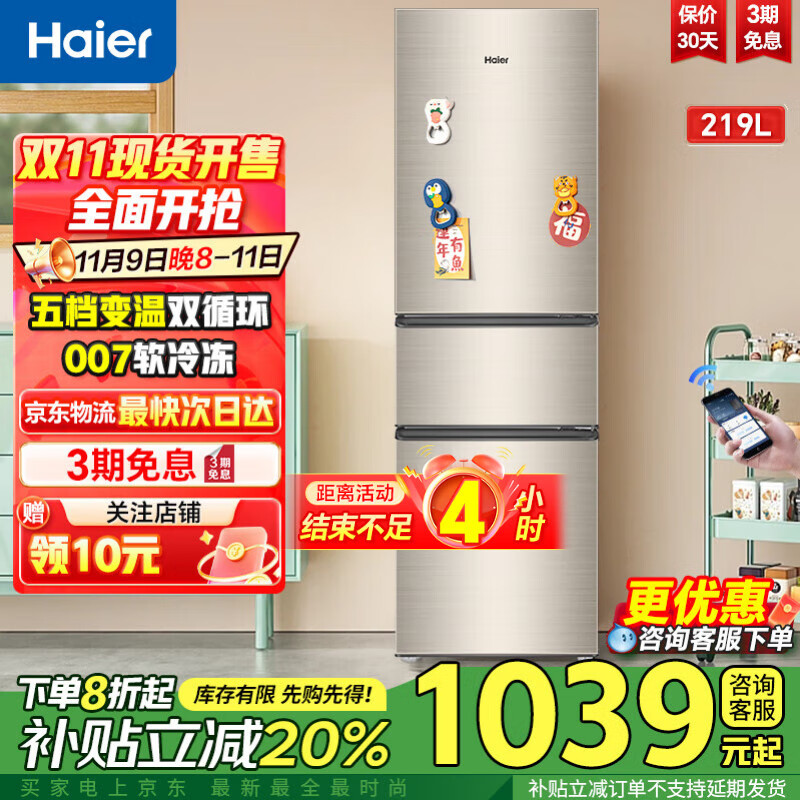 包邮 海尔冰箱219升三开门冰箱小型家用电器宿舍租房小冰箱多温区保鲜冷冻节能低噪超薄国家补贴以旧换新 219升三门直冷节能丨007软冷冻